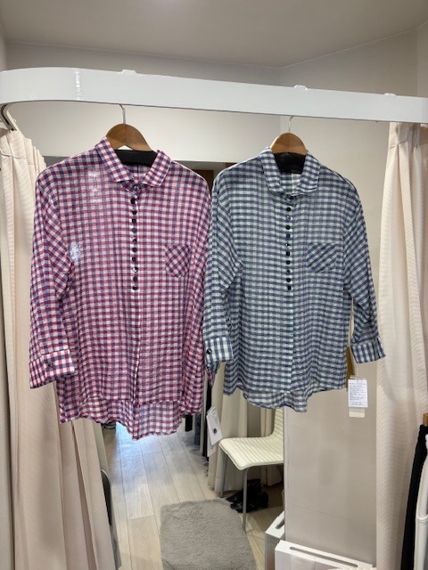 定番人気のギンガムチェックブラウスは夏まで着用出来る軽い素材感¥17000税抜きフラウエプラス